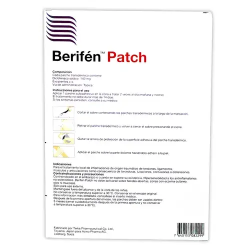 Berifen Patch no es un simple parche “caliente” como los mentolados. Es un sistema de liberación de fármaco que contiene 140 mg de Diclofenaco Sódico impregnado en una matriz adhesiva.