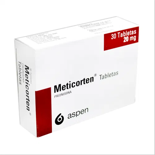 Meticorten es una marca comercial cuya sustancia activa es prednisona en esta presentación de 20 mg por tableta.